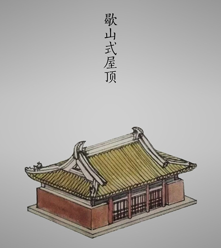 歇山式顶是中国古代建筑屋顶形式一种,外观似硬山顶与庑殿顶的结合。上部如硬山顶,两山面垂直,与前后坡构成三角形立面,下部出坡至檐部。有一条正脊、四条垂脊、四条戗脊,俗称九脊殿。歇山顶屋脊上有各种脊兽装饰,其中正脊上有吻兽,垂脊上有垂兽,戗脊上戗兽和仙人走兽,其数量和用法都有严格等级限制的。在屋面瓦的使用上,歇山式屋顶大多使用黄色的琉璃瓦进行装饰。